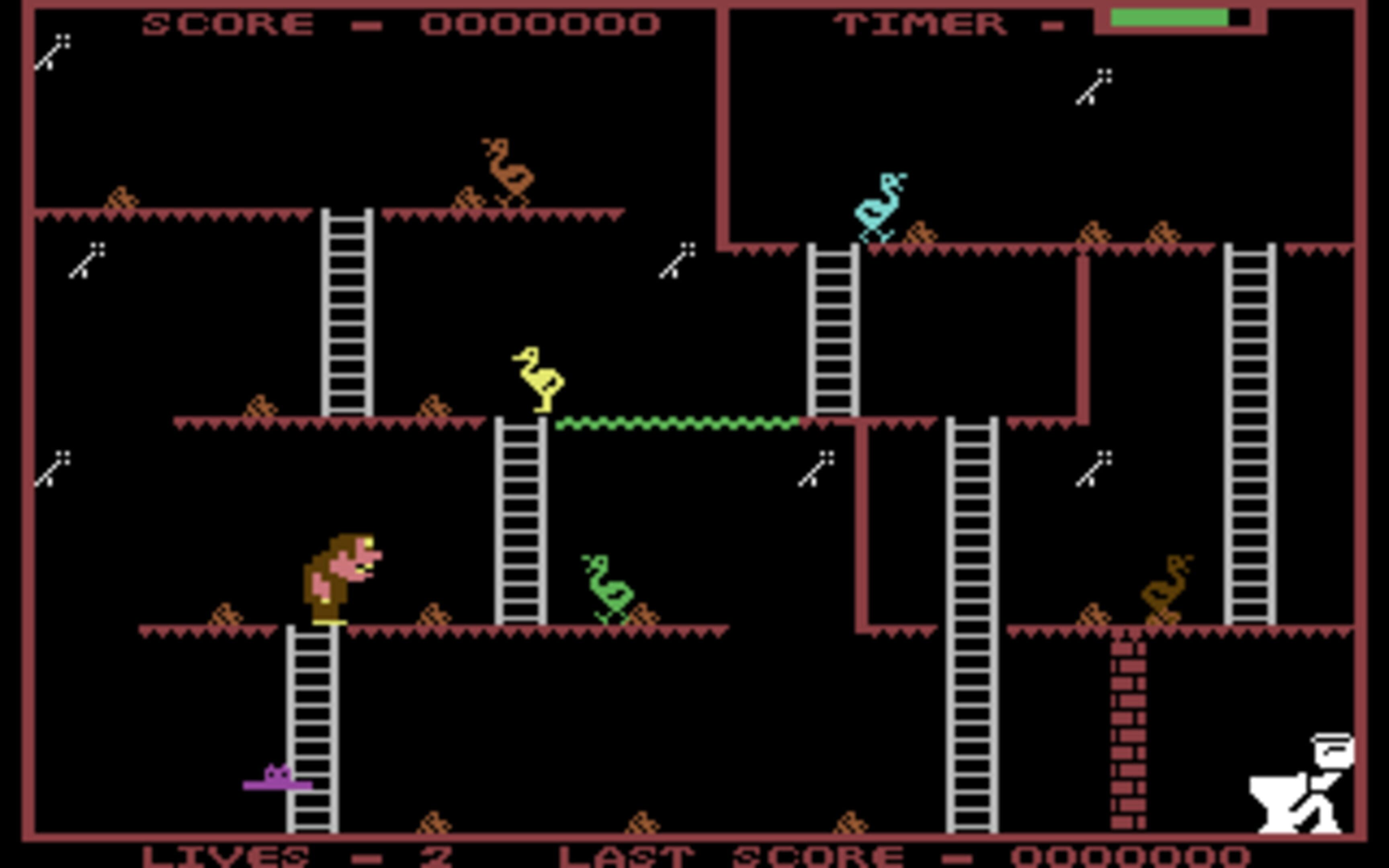 Poor Manky is absolutely desperate for the toilet, but some joker has walled it up! If he’s going to get to the bog in time, along with the keys scattered around the screen he’ll have to collect a quota of eggs which are laid by the roaming yellow bird that also consumes the piles of grain littered about the place – Manky himself has a violent and fatal reaction to the grain, although if he first chows down on an egg he can eat one pile.